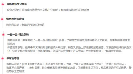 2026年3月17日,监测到标题为“云南旅游10天9晚昆明大理丽江西双版纳玉龙雪山洱海吉普旅拍跟团”的旅游产品,涉及“民族特色文化中心”“纳西民俗体验馆”“一县一品.精品版纳”“傣家生态园”四个购物点。