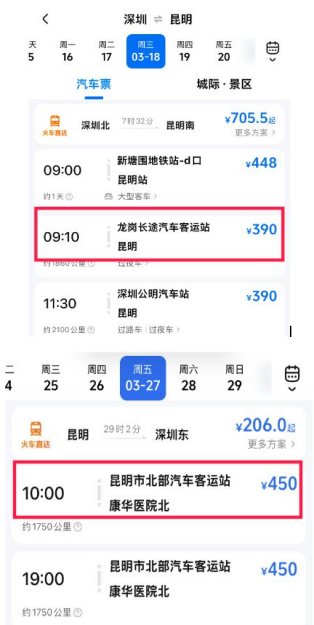 此行程包含往返汽车票、住宿、餐饮、景区门票、等费用。从行程看,从深圳至昆明出发时查询的汽车票为390元,从昆明至深圳的汽车票为450元,往返一共840元。