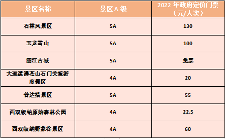 根据云南省《2026年旅行社云南旅游产品参考成本消费提示》,结合政府指导价及市场调节价A级景区名单计算得出: