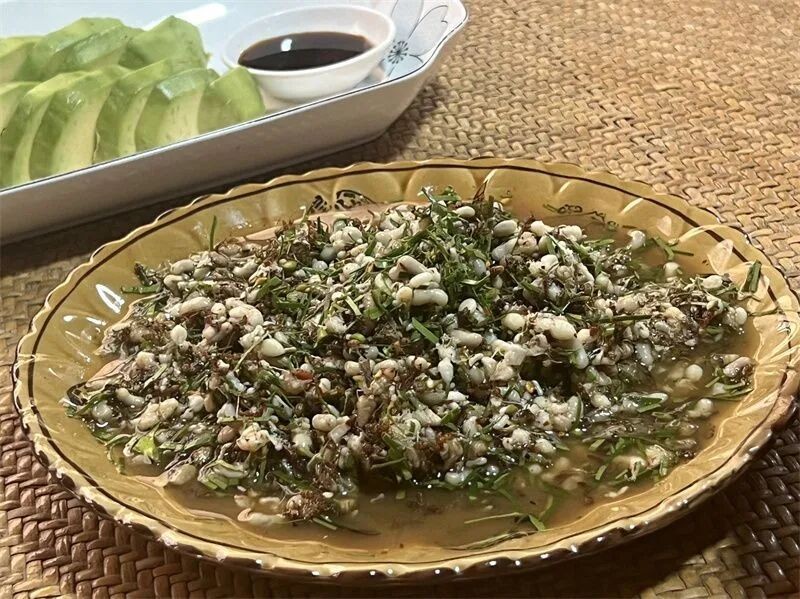 普洱特有的美食,因体内含有蚁酸而得名。常用来制作酸蚂蚁蘸水,将酸蚂蚁捣碎,加辣椒、蒜末、香菜,酸辣开胃,是烤肉、烤鱼的绝配。也可以煮酸蚂蚁汤,酸爽独特。