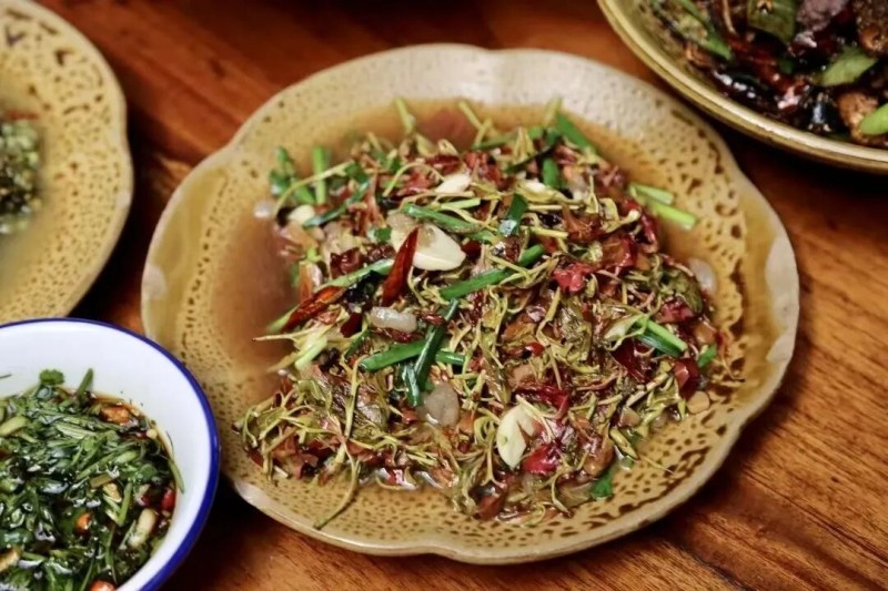 酸尖的嫩芽酸溜溜的,开胃生津。可直接蘸盐巴辣子生吃,也可煮酸笋鱼时放几片,增加风味层次。
