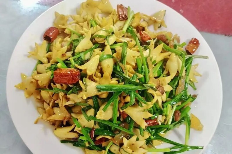 苦藤花也叫南山藤花,名字带“苦”,但经过处理后的苦藤花只有淡淡清苦,更多的是回甘,是深受普洱人喜爱的一道花菜,多用来爆炒,或拌入蛋液中做成煎饼,口感香脆爽口。