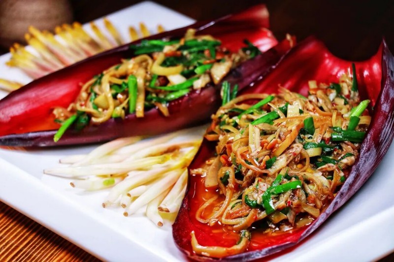 芭蕉花是普洱人的心头好。剥去深红色苞片,取中间嫩心切丝,需反复搓洗去除涩味,再炒韭菜、豆豉或煮罐头肉吃,口感滑嫩鲜美。
