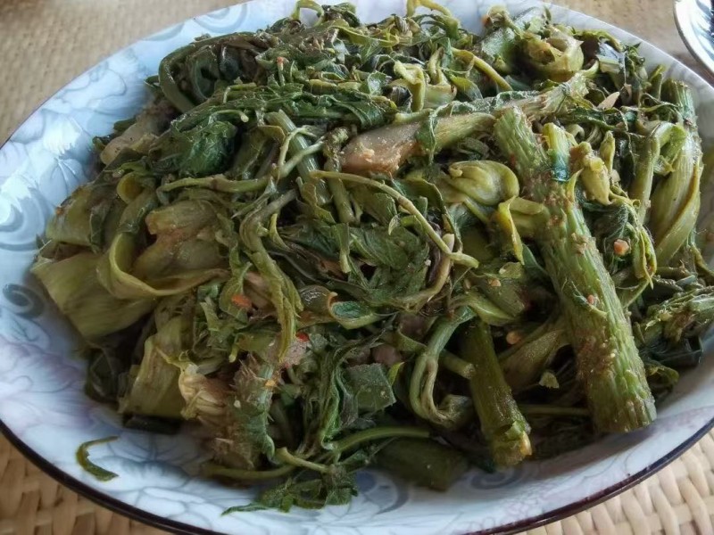 浑身是刺,取顶端的嫩苞。需戴手套采摘处理,去皮后焯水,与腊肉同炒。肉质厚实,口感像笋又像菜,清甜爽口。