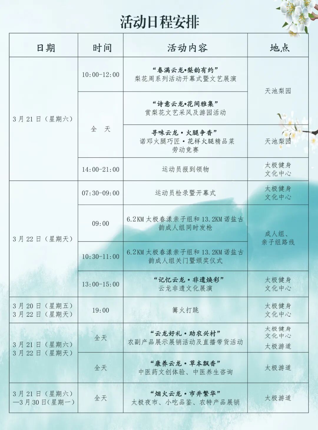 在天然太极的油菜花间,在千年诺邓的古村古道,在万亩梨花盛放的天池梨园,让我们徒步山野,挥洒汗水,享受户外运动的激情和快乐,探访云龙自然风光,感受千年盐马古道人文底蕴。