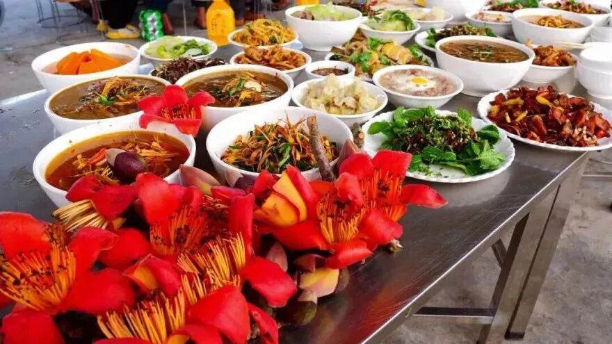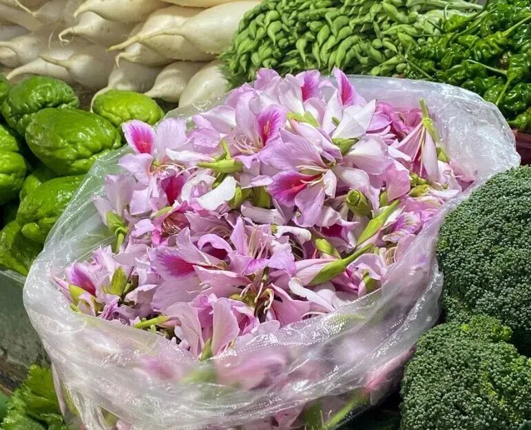 此时正是红河人吃花的最好节令,在集市里,玉荷花、金雀花、苦刺花……带着晨露从山野运来。玉荷花炒韭菜清雅甘甜,金雀花煎蛋金黄浮香,苦刺花炒腊肉微苦回甘,这是红河人对时令的回应,也是舌尖上的迎春仪式。