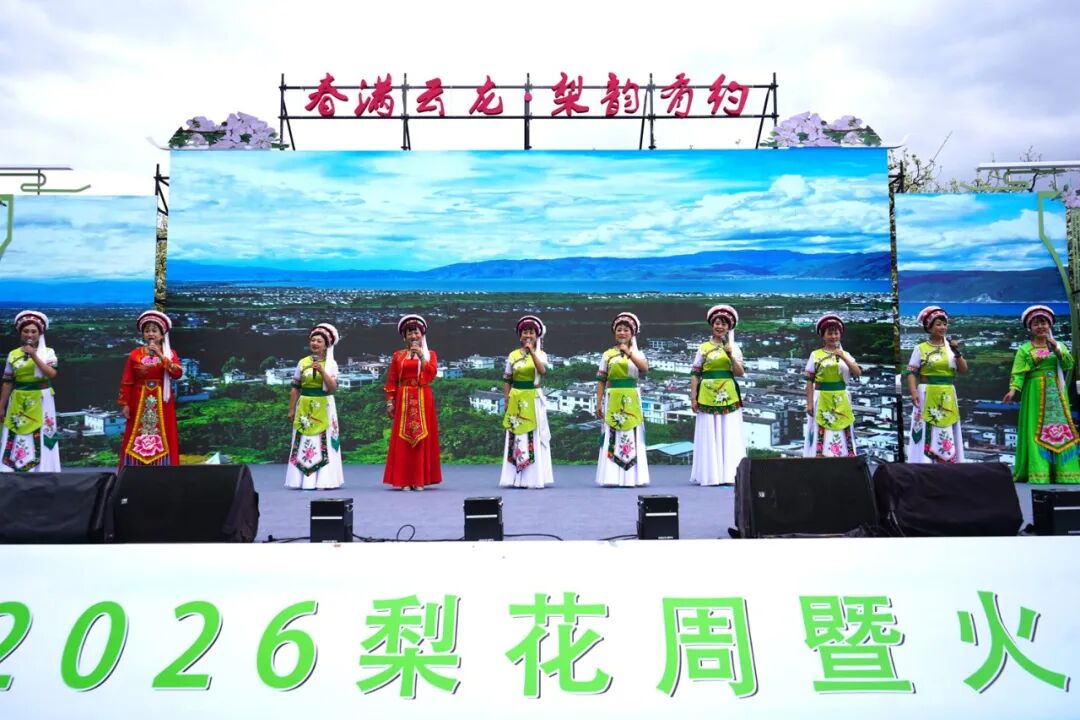 开幕式上,云龙县吹吹腔艺术团、云龙县老年人体育协会、大理花想蜜组合、大理州白剧团和诺邓镇九年制学校的小朋友们等表演者,为到场的来宾及媒体记者们送上了独具云龙特色的文艺展演。文艺展演在开场舞《耍马幸福来》中拉开帷幕,欢快的节奏瞬间点燃全场。随后,《心肝票》的深情旋律、《力格高》的童真童趣、《大地欢歌》的磅礴气势、《阿妈的花裹背》的细腻温情、《小荷叶》的清新俏皮接连登场,或婉转悠扬、或活力四射,每一个节目都精准戳中观众的情感点,将现场氛围推向一个又一个高潮。最后,全体演员带来的《相亲相爱》为展演画上圆满句号,余韵悠长,观众的掌声与欢呼声回荡在万亩梨花间。