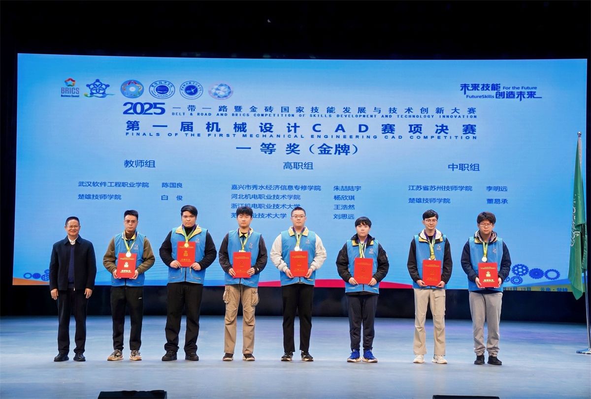 2024年,学院选派的3名选手在金砖国家职业技能大赛——机械设计CAD和机械行业职业教育技能大赛“CAXA数码大方杯”工业数字化关键技术应用项目比赛中荣获一等奖,首次摘得国家级赛事桂冠。