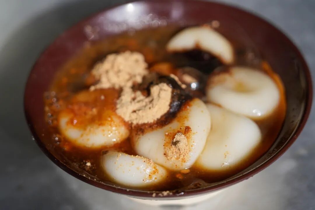 翠绿的糕面浇过暗红的糖汁