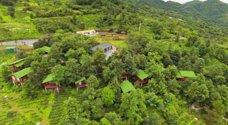 白竹山景区内的茶山里树屋酒店,散落于万亩茶园之中,红墙木屋与绿意相映,营造出隐于自然的秘境氛围。