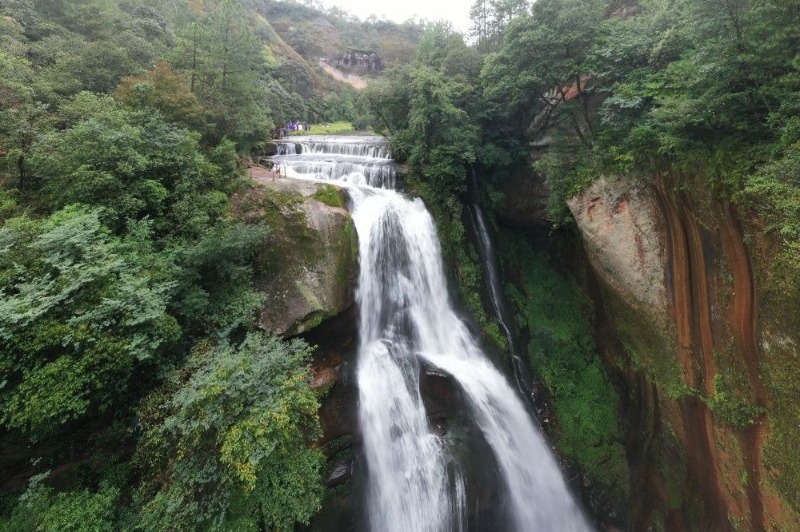 走近三潭瀑布,举目仰望,眼前的瀑布气势恢宏,巨大的水流从天而降,沿着悬崖飞流直下,多级瀑布自然连缀,一气呵成,强烈撞击着你的视觉神经,撼人心魄。