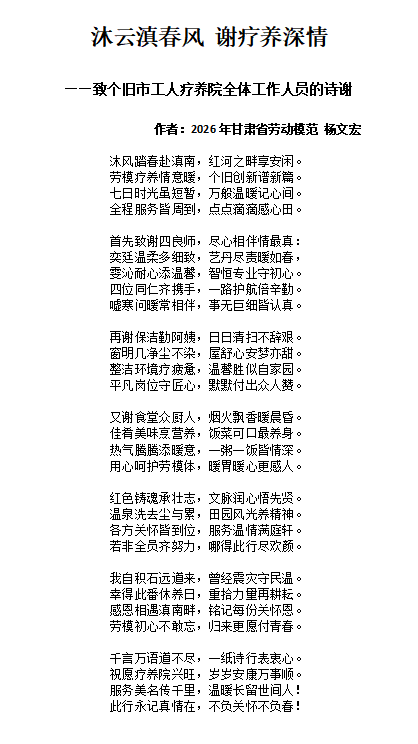 来自甘肃省积石山县的劳模代表杨文宏,在感谢诗《沐云滇春风 谢疗养深情》中写下自己的真切感受:“整洁环境疗疲惫,温馨胜似自家园”“劳模初心不敢忘,归来更愿付青春。”这不仅是个人心声的流露,也道出了全体疗养团成员对此次疗休养之旅的由衷认可。