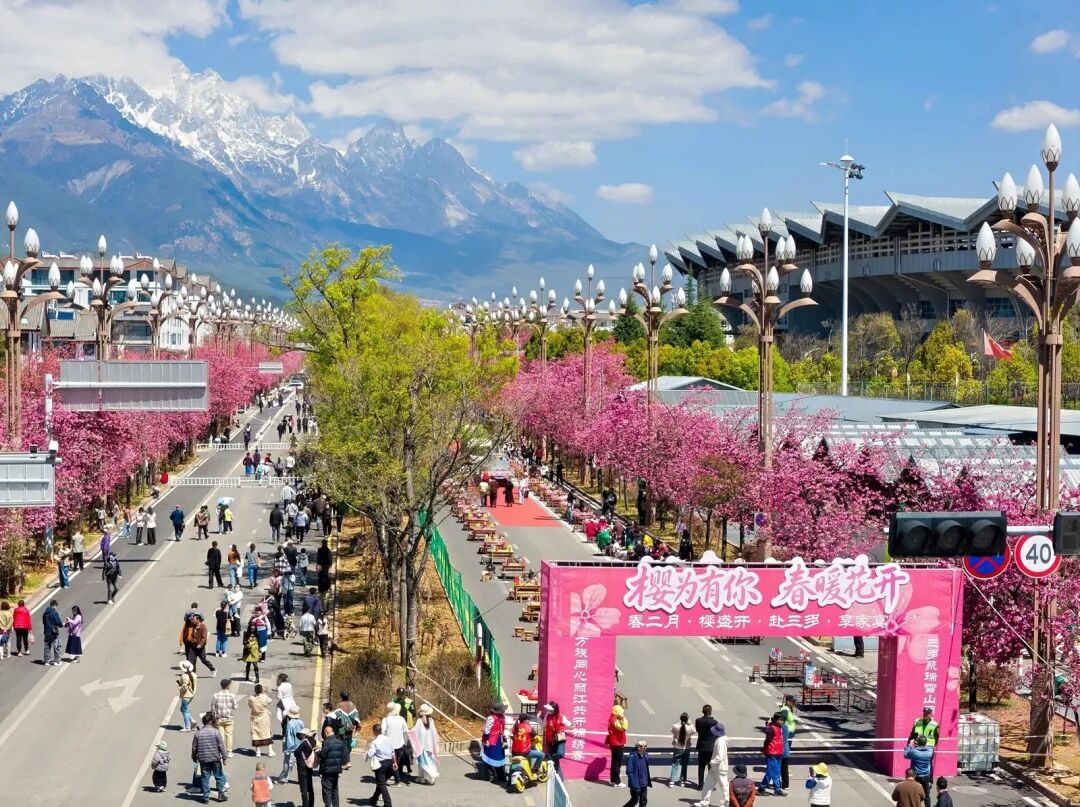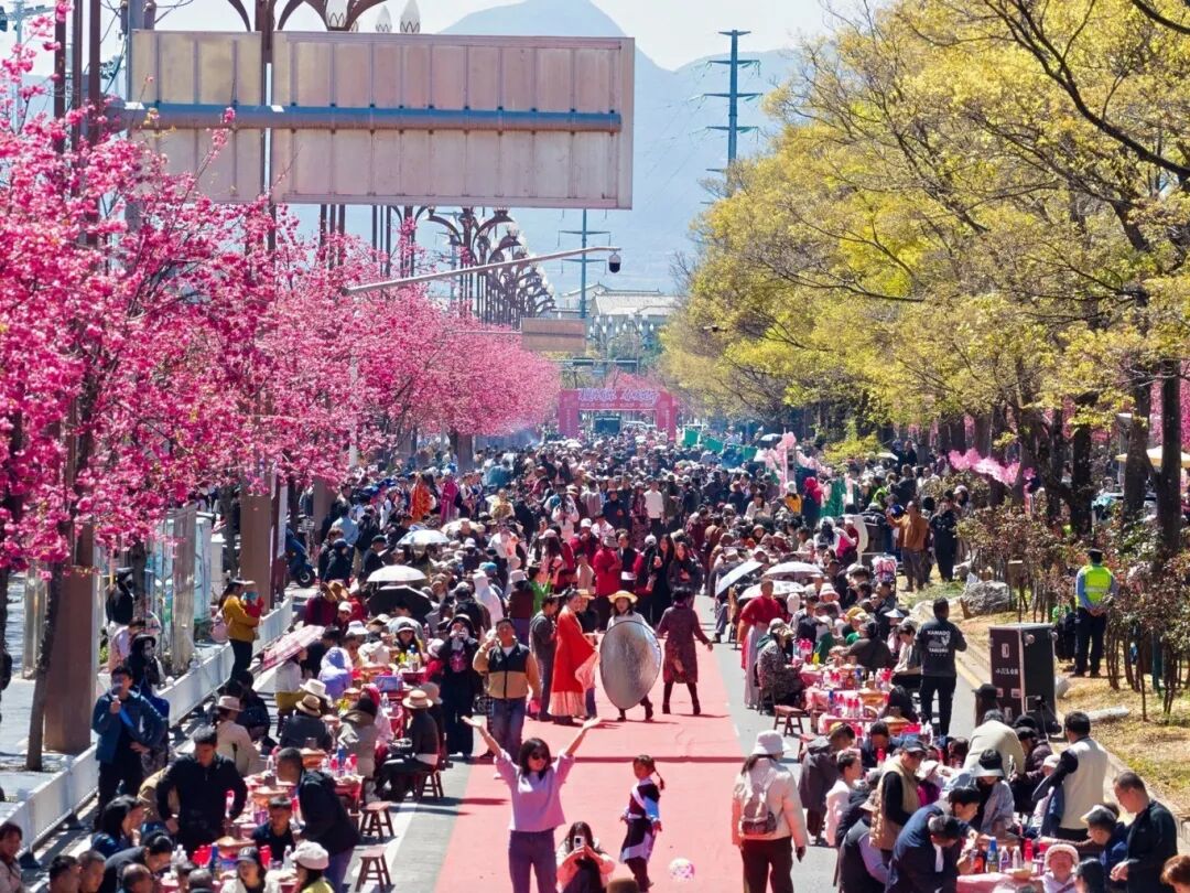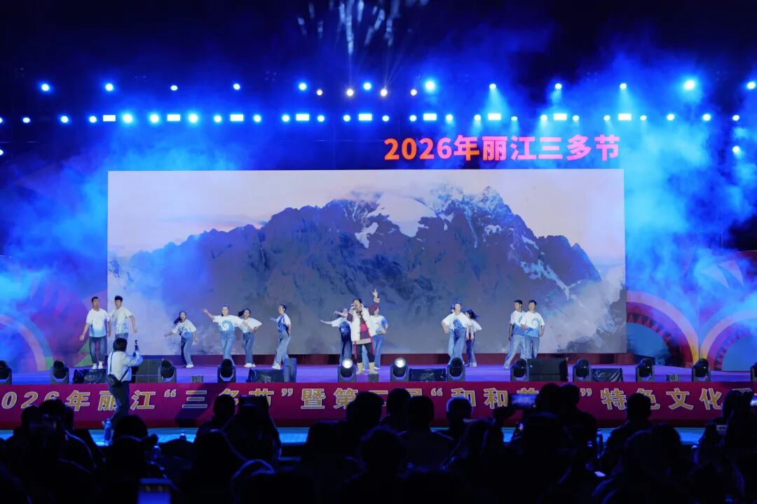 中午时分,雪山路樱花大道上摆起“千人长街宴”,非遗服饰秀与烂漫樱花相映成趣;下午,“樱花树下下午茶”为市民、游客带来别样的沉浸式体验;同日下午,还同步举办了2026年丽江“三多节”暨第二届“和和美美”特色文化季文化研讨会,围绕民族文化传承与区域文旅协同发展等议题展开深入研讨;夜幕降临,开幕式晚会在丽江市体育发展中心主舞台精彩上演,晚会汇聚了中国东方演艺集团、德宏州民族文化工作团、迪庆州文化馆、大理州剑川县文化馆及丽江市本地文艺院团的优秀节目,充分展示了云南多元民族文化的独特魅力与中华文化的博大精深,赢得现场观众阵阵掌声。