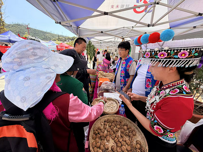今年的“二月八”,不仅是文化的盛会,也成为推动乡村产业发展的重要平台。“好物蟠猫”农特产品展销区人气火爆,腊火腿、土鸡蛋、萝卜干、土蜂蜜等本土优质农特产品整齐摆开,吸引了大量游客驻足选购。商贸物资交流活动也同步开展,县内外商户云集,特色小吃、民族手工艺品琳琅满目,极大丰富了活动物资供应。来自元谋的游客徐美在活动现场兴奋地说:“这里交通方便,民族氛围特别浓,今天顺路到这里玩,对这里的彝族风情、美食还有刺绣印象非常深刻,是一个山好水好的地方”。