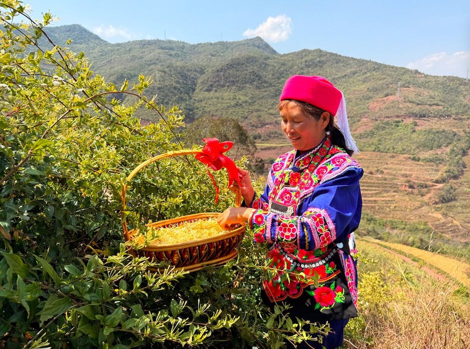 初春时节,云南省楚雄彝族自治州双柏县安龙堡乡的金银花迎来盛花期。在连片的金银花田里,一簇簇黄白相间的花朵在春风中摇曳,村民们正忙着采摘这“致富花”。走进双柏县安龙堡乡说全村的山地坡谷,成片的金银花在微风中摇曳,金蕊银瓣在阳光下熠熠生辉。空气中弥漫着淡淡清香,身着彝族服饰的村民们挎着竹篓穿梭其中,他们挎着竹篮,手指在花枝间灵巧翻飞,熟练地采摘着绽放的花蕾。