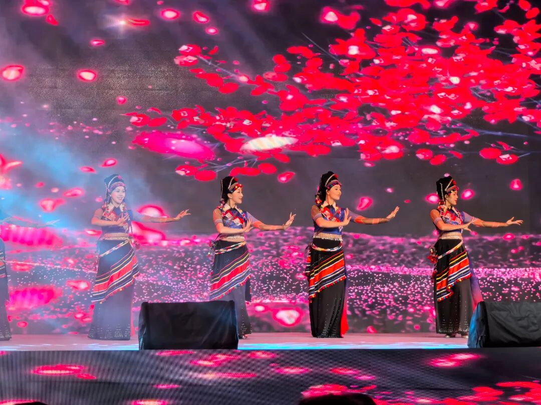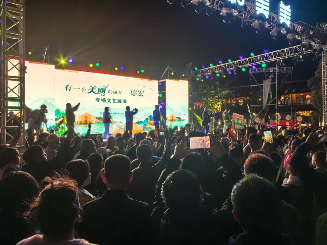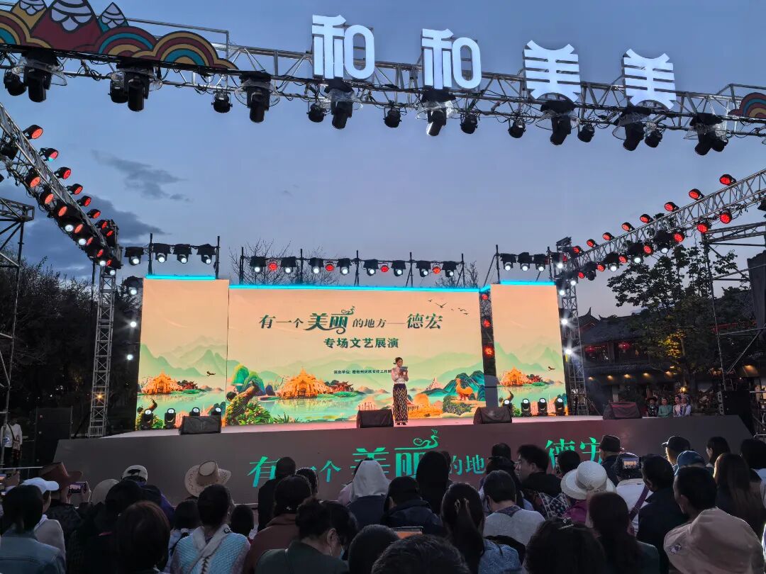 晚会在欢快的乐曲声中开场,德宏州精心编排的节目轮番上演。《有一个美丽的地方》以柔美的舞姿和悠扬的旋律,勾勒出德宏如诗如画的自然风光;《文崩目栋》节奏明快,展现了景颇族人民的豪迈热情;《德昂山的春天》则用灵动的表演,诉说着德昂山乡的生机与希望。演员们身着绚丽的民族服饰,载歌载舞,将德宏独特的文化魅力展现得淋漓尽致,现场掌声、喝彩声此起彼伏。