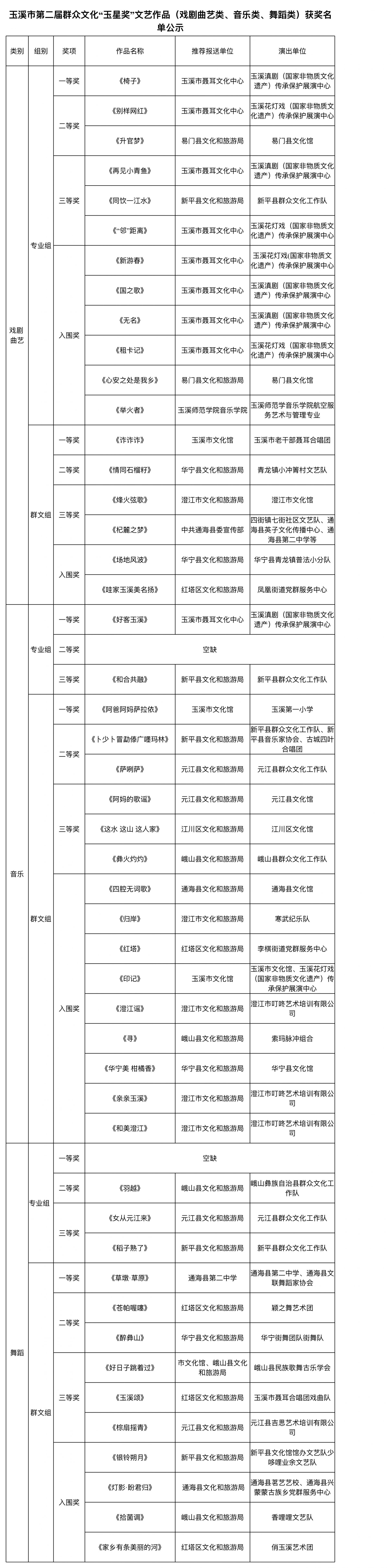 附件:1.玉溪市第二届群众文化“玉星奖”文艺作品(戏剧曲艺类、音乐类、舞蹈类)获奖名单公示