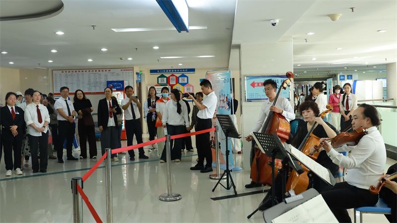 启动仪式结束后,乐手们遵循轻柔、安静、不影响诊疗的原则,在门诊一楼大厅、二楼采血中心候诊区、三楼超声检查候诊区奏响旋律,一首首经典舒缓的曲目接连上演。悠扬的旋律化作温暖的力量,融入医院的每一个角落。