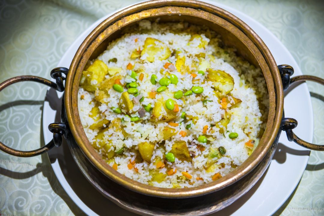 金黄的洋芋和米饭与红艳的火腿、嫩绿的青豆完美结合,香气扑鼻,可谓色香味俱全,是铜锅鱼的黄金搭档。