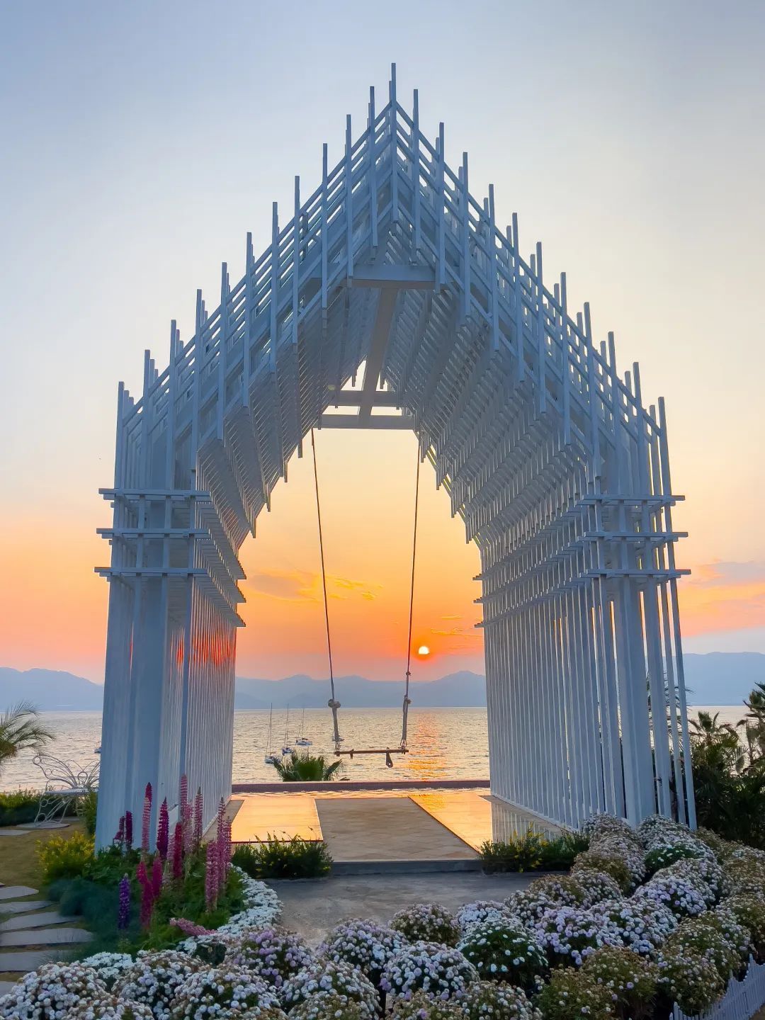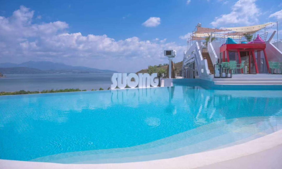 太阳山景观栈道位于抚仙湖国际度假小镇汐宿会所旁,一条长320米的景观栈道像洁白的玉丝带轻盈地悬立在山坡之间。走在栈道上,可看落霞余晖,看湖天一色,感受不一样的抚仙湖之美,是观景、拍照打卡的必选之地。