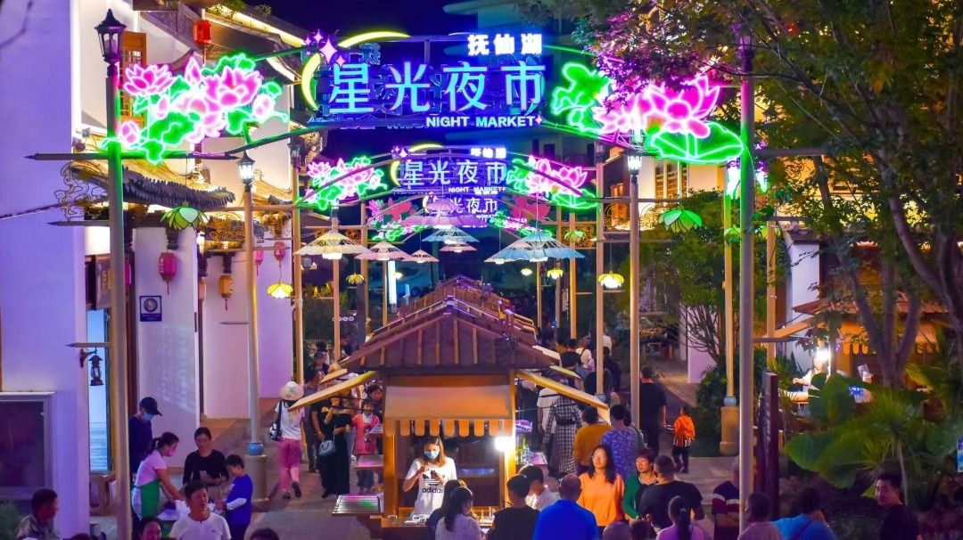 广龙小镇是集住宿、餐饮、文创、娱乐于一体的湖畔休闲小镇。小镇建筑红墙白瓦,壁画精致,出片率超高,适合度假、拍照、购物。星光夜市热闹非凡,有文创集市可淘好物,还有精彩舞台演出和篝火晚会,氛围热闹。