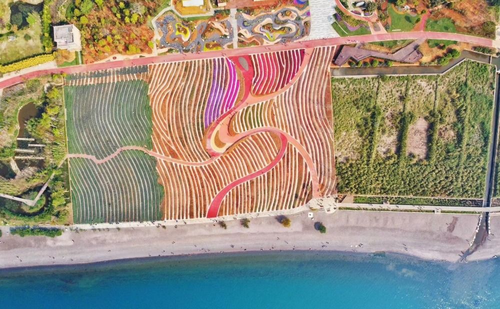位于抚仙湖北岸的抚海湾湿地公园风光秀丽、景色宜人,绚烂夺目的七彩花田与碧水蓝天相互辉映,交织成一幅绝美的山水田园画卷。五颜六色的鲜花有序排列,勾勒出大片几何形状的花海,与抚仙湖无缝拼接。一边是波光粼粼、清澈见底的抚仙湖水,一边则是琳琅满目的花海铺满整个湖岸,入眼之处,皆是风景。