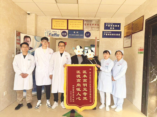 与此同时,县人民医院骨科也用精湛医术为一名骨折患者带来新生。58岁的患者阿姨因车祸导致股骨颈骨折头下型合并肱骨骨折,入院后完全丧失站立和行走能力,长期卧床的现状让其陷入焦虑。县人民医院骨科医护团队详细评估患者病情后,为其量身定制“全髋关节置换+肱骨切开复位内固定术”个性化治疗方案,在加速康复外科(ERAS)理念的科学指导下,成功为患者实施手术。术后恢复效果超出预期,患者第3天便能借助助行器下地行走,一周后即可自如行走,重新找回站立与行走的喜悦。患者及家属满怀感激,为骨科送上绣有“医术高明见奇效,医德高尚暖人心”的锦旗,用朴实的话语传递着对医护人员的由衷赞誉。