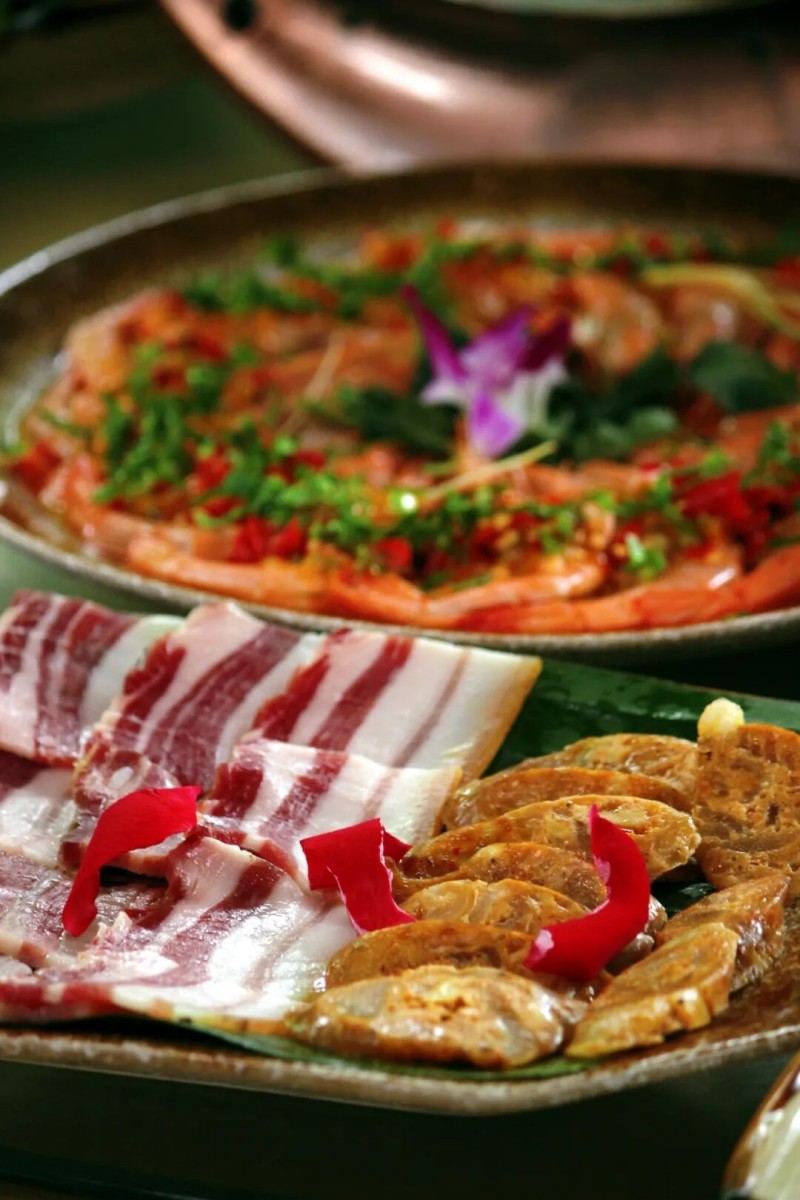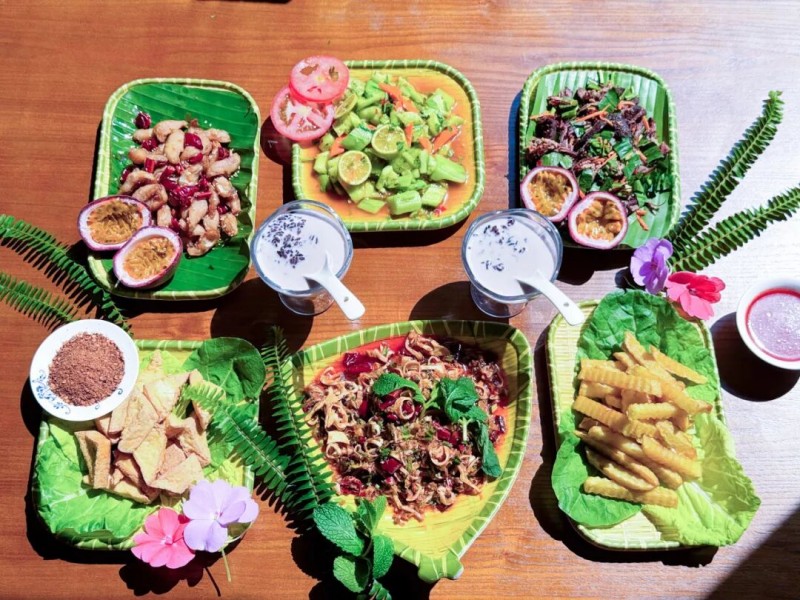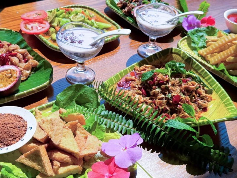 逛累了,就去景区内的宝藏餐厅“瑟哆啰”。落地窗外就是园区美景,紫色格调氛围感拉满。恰逢清明春日限定菜单上新,用墨江本地应季食材烹制的哈尼特色美食,每一口都是大自然的鲜美。