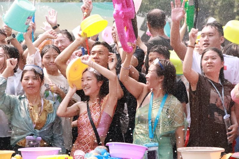 傣族人民崇尚水,泼水节期间,人们相互泼水表示祝福,傣族村寨里洋溢着欢声笑语