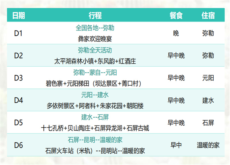 六天行程从弥勒开始,这座“与佛同名”的城市,四月里太平湖花海烂漫,东风韵艺术小镇的郁金香与薰衣草次第绽放。我们入住温泉酒店,在花海环绕中享受滇中温泉。前往蒙自碧色寨,三角梅与月季开满法式站台,您可身着民国服装,体验“穿越百年”的旅拍。元阳梯田的春日灌水期,是大地最美的镜子,阿者科村的蘑菇房旁,哈尼人正准备着春日的长街宴。最后抵达石屏,乘坐个碧石铁路的米轨小火车,穿越异龙湖畔的花海湿地,在古城的科举翰林府邸中,品一杯石屏古茶,感受“文献名邦”的斯文传承,让这趟旅程在茶香与花香中温暖收尾。