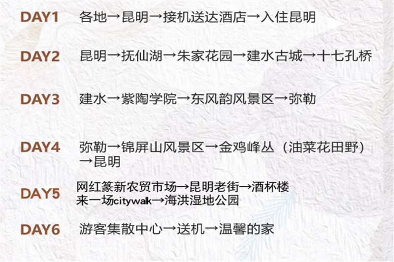 这条六日经典线路,从昆明出发,经玉溪抚仙湖畔的春日花海到达红河。在建水,可以开启一场深度的古城City Walk。在朱家花园的亭台楼阁间,品一杯普洱,体验“斯文人家的慢生活”;在西门大板井旁,看豆腐与茶水的晨昏相伴;登临朝阳楼,俯瞰古城烟火。春日里,元阳梯田注水如镜,倒映天光云影;蒙自碧色寨的法式建筑群中,手捧一杯越南滴滤咖啡,瞬间穿越回《芳华》岁月。最后抵达弥勒,在东风韵的万花筒花海与艺术建筑间,用一杯云南红酒结束这趟寻味之旅。