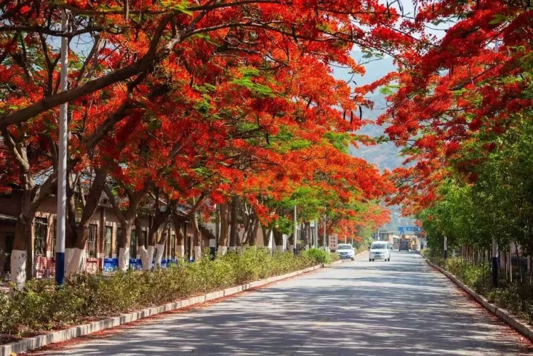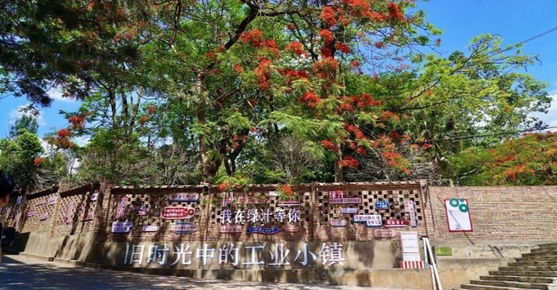 每年的四五月份,绿汁镇沿江公路、矿厂老街区及“凤凰大道”两侧,凤凰木竞相怒放,火红的花簇与斑驳的黄墙、老式职工宿舍楼形成强烈视觉冲击,随手一拍就是“工业怀旧+自然烈焰”的大片。