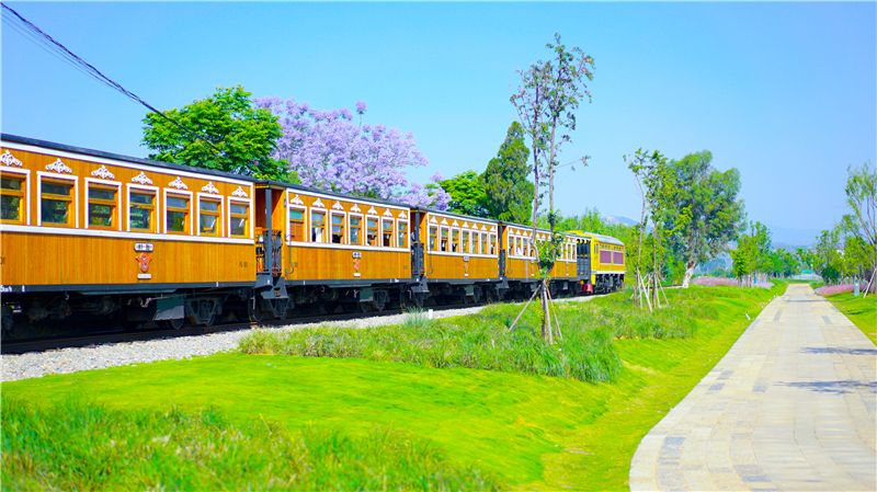 建水蓝花楹也悄然盛开,微风吹过,紫色花串随风摇曳。乘着建水古城橘黄色的小火车,穿过清香稻田,窗外是蓝紫色的花海与湛蓝色的天空,随手一拍,就能收获犹如动画场景般清新的大片。