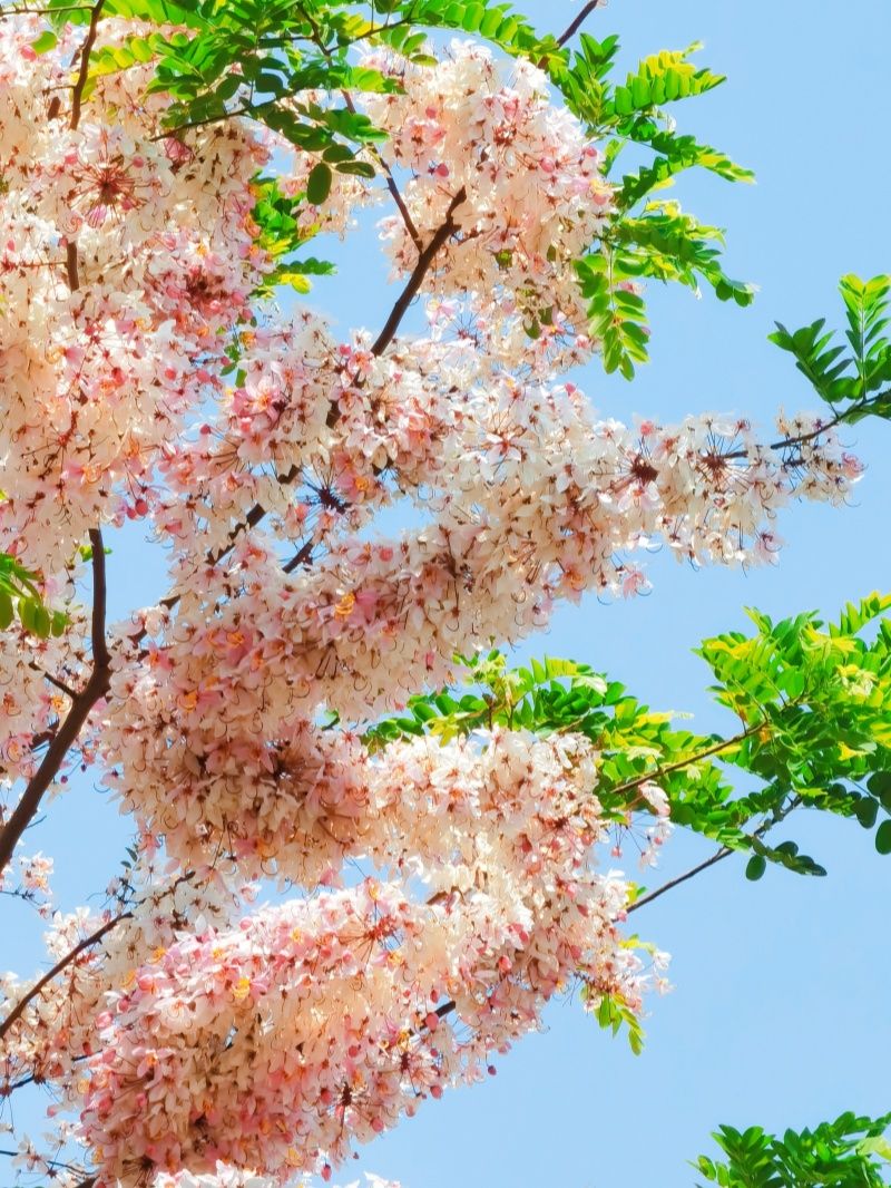 微风拂过,粉白的花瓣轻柔摇曳,阳光透过枝叶洒下斑驳光影,为这片粉色云雾增添了几分梦幻。