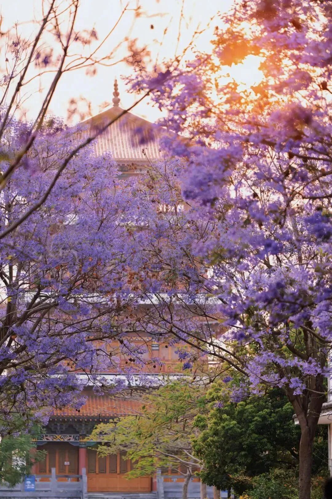 四月开始,开远的蓝花楹率先登场。伸展的枝丫盛满蓝紫色的花朵,为整座城市染上了一层浪漫的滤镜,泸江河蜿蜒流淌,花瓣簌簌飘落,美得动人心弦。