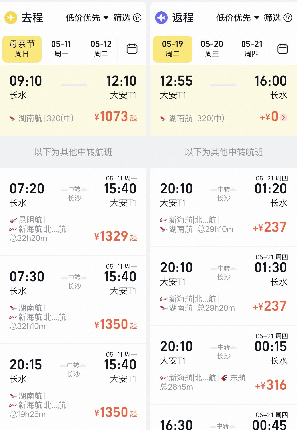从行程看,从济宁出发至昆明出发时查询的往返机票价格1073元。