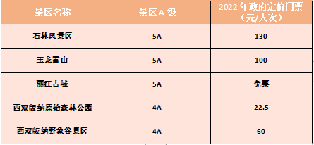 根据云南省《2026年旅行社云南旅游产品参考成本消费提示》,结合政府指导价及市场调节价A级景区名单计算得出:
