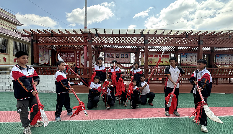 构建“非遗+德育美育”融合育人体系,深入挖掘大刀舞、左脚舞、民间刺绣等本土非遗资源,将其作为涵养家国情怀、培育乡土认同、铸牢中华民族共同体意识的重要载体。统筹建立“传承人进校园、非遗进课堂、文化进心灵”机制,累计聘请3名非遗代表性传承人担任校外辅导员,覆盖学生556人(次)。以“课堂+活动+文化”为抓手,将大刀舞的刚毅豪情、左脚舞的团结热烈、刺绣的匠心专注融入思政教育和美育实践,组织铸牢中华民族共同体意识主题研讨活动、民族团结进步示范学校活动汇报表演、非物质文化遗产节、少年宫活动展演等主题活动24场,引导学生在传承中厚植责任担当,在文化认同中增进民族团结。投入78万元打造乡村少年宫非遗工坊,建成刺绣作品陈列室3间,学生创作刺绣作品460余件,其中有3件荣获省级文创作品优秀奖,真正实现以文化人、以美润心。