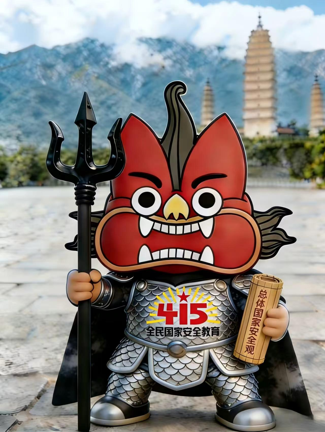 该IP形象以大理传统瓦猫为原型(瓦猫是大理白族极具代表性的民俗瑞兽,常端坐于民居屋脊、门头之上,以威严之姿镇宅驱邪、护佑家宅,它承载着白族群众对家园安宁、生活顺遂的质朴期盼,这份守护初心,与国家安全筑牢防线、守护一方平安的使命高度契合),将大理本土传统文化与现代国家安全理念深度融合,让传统瓦猫文化焕发时代新声;右手持三叉戟(为大理民间传统护卫神大黑天神的兵器);左手执标有“总体国家安全观”字样的竹卷书;身穿印有“4·15全民国家安全教育”标识的铠甲,身披利用传统白族扎染工艺制作而成的由“众”字为形状内含“国家安全,人人有责”字样的披风,意示着“国家安全,人人有责”和维护国家安全需要“你我他”的共同参与。