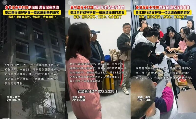 今年年初旅游高峰期,一支38人的散拼旅游团因旅行社未提前预订住宿,在思茅区入住计划落空,辗转至墨江县后仍面临“一房难求”的困境。墨江县接到求助后,第一时间启动应急响应机制,文旅、应急等相关部门值班人员连夜排查县城及邻近乡镇内可承接团队住宿的酒店、客栈,因旅游高峰期间房源全面饱和,文旅部门迅速上报相关情况。在墨江县人民政府统筹协调、全力调度下,38名游客被妥善安置在县委党校宿舍,以兜底保障彰显普洱待客温度。
