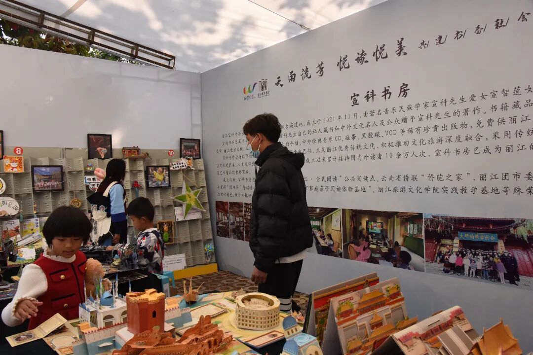 汇聚了市、县区图书馆、特色分馆、市文联、市博物院、东巴文化研究院,以及杉野自然、拾得大地、科创木艺、白沙锦绣院、东巴文化纸坊、俊宇、和钧工艺品工作室等知名非遗、研学、文创机构的主题展位。