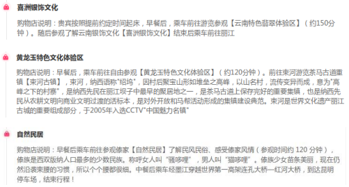 2026年4月17日,监测到标题为“昆明大理丽江西双版纳9天8晚。雪山索道+歌舞表演+洱海游船”的旅游产品,涉及“喜洲银饰文化、黄龙玉特色文化体验区、自然民居”三个购物点。