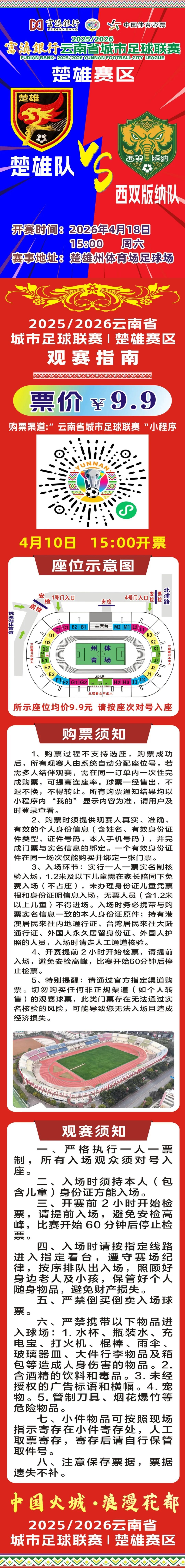 楚雄队VS西双版纳队门票已开售