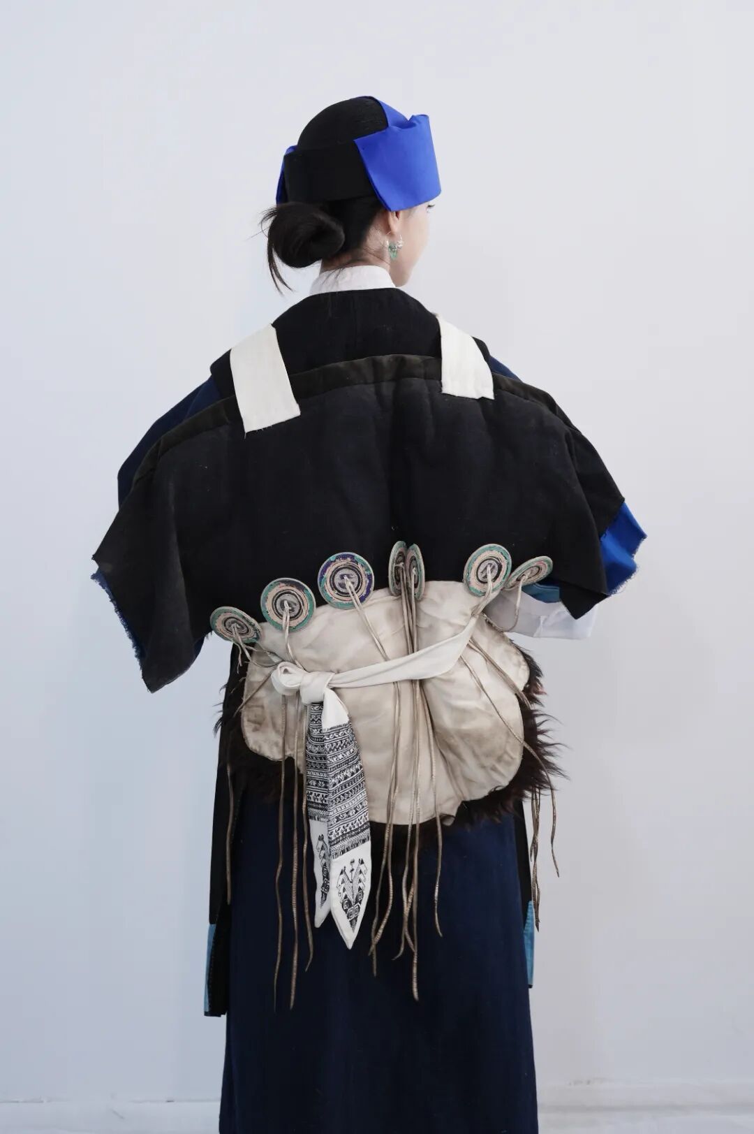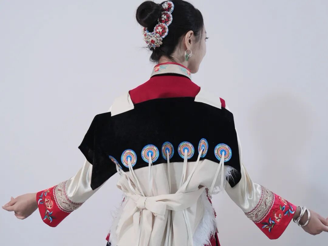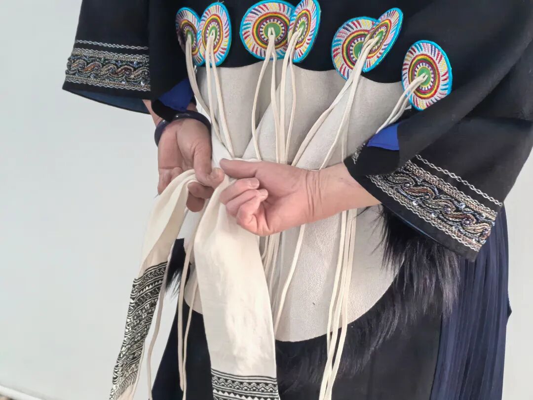丽江纳西族羊皮背披肩,俗称“披星戴月”,是纳西族女装中最具标志性的部分。其造型上方下圆:上部缀有两个大圆布盘,左侧为日,右侧为月;底部钉有七枚彩绣圆盘,象征北斗七星。整体寄寓着“肩挑日月,背负七星”的美好意蕴。朴拙古雅的色调,极具美感的造型,浓缩了纳西文化中独特的图腾信仰、审美情趣与生活智慧。