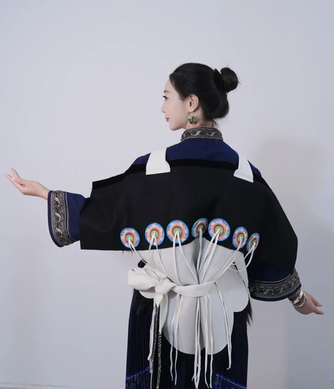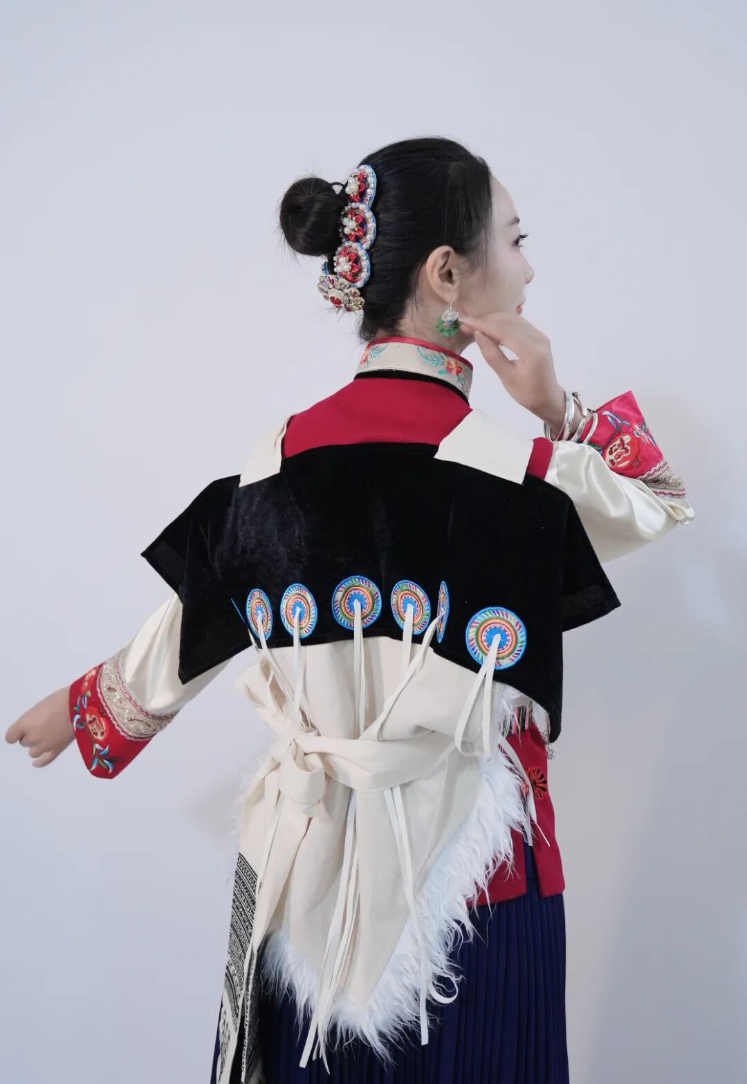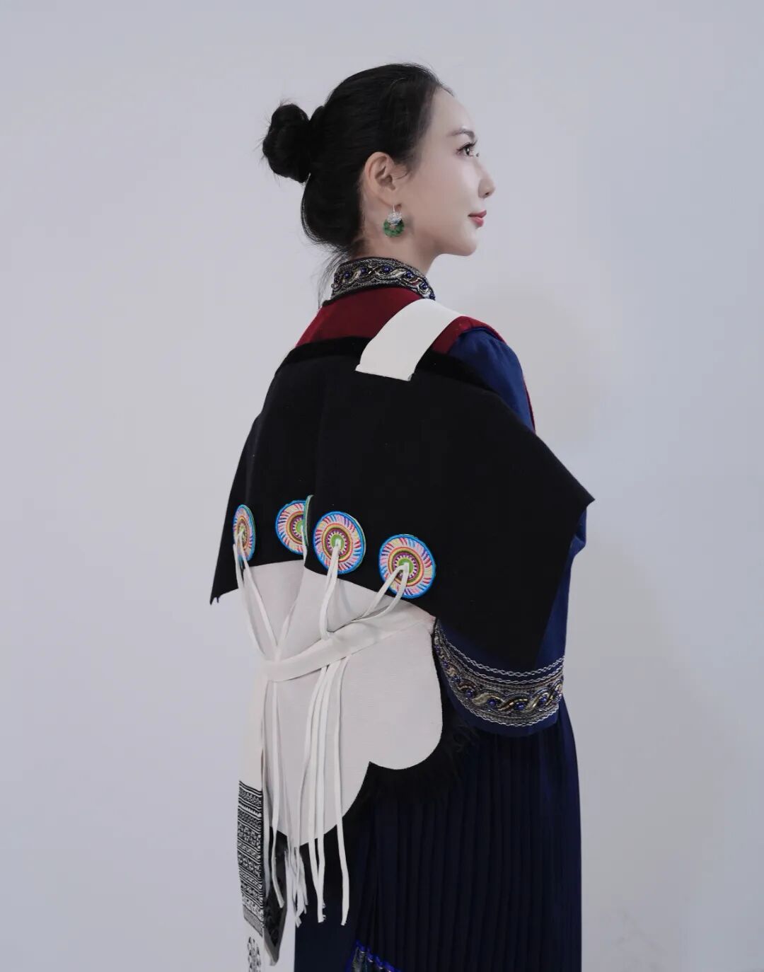 丽江纳西族羊皮背披肩,俗称“披星戴月”,是纳西族女装中最具标志性的部分。其造型上方下圆:上部缀有两个大圆布盘,左侧为日,右侧为月;底部钉有七枚彩绣圆盘,象征北斗七星。整体寄寓着“肩挑日月,背负七星”的美好意蕴。朴拙古雅的色调,极具美感的造型,浓缩了纳西文化中独特的图腾信仰、审美情趣与生活智慧。