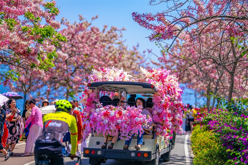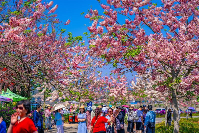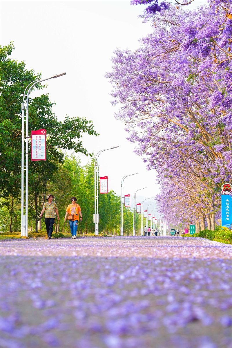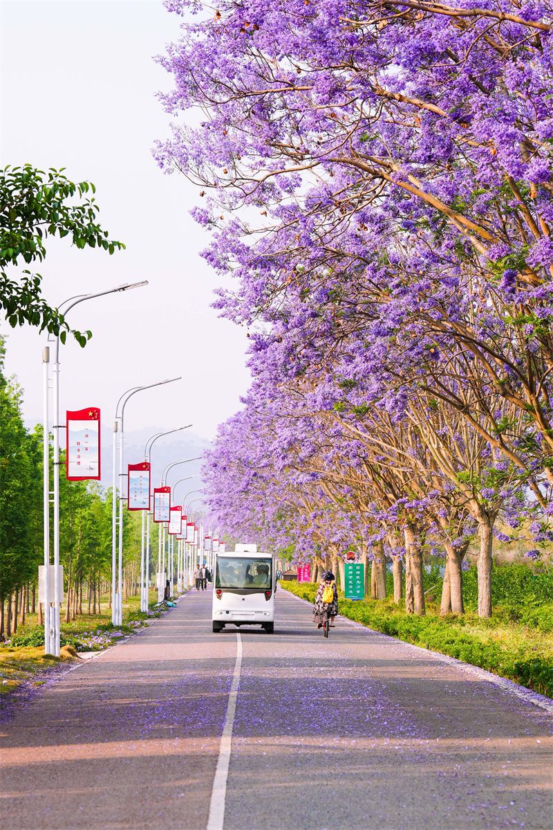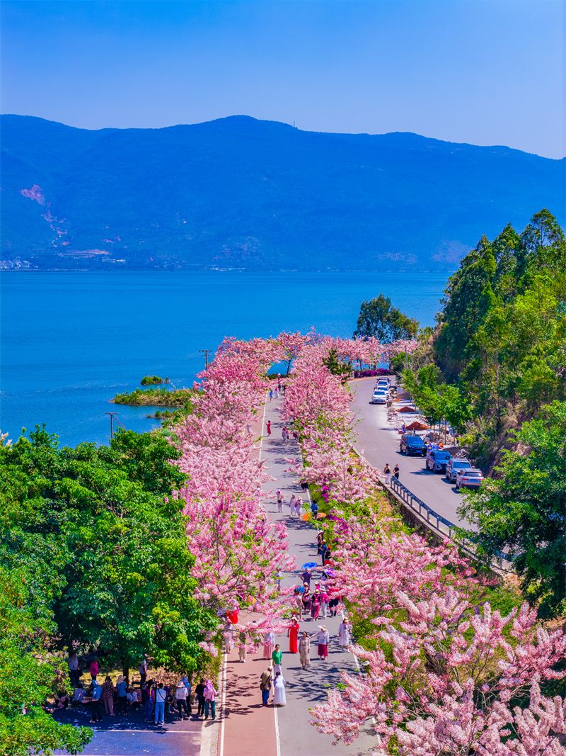 四月的石屏,被温柔撞了个满怀,神黄豆花与蓝花楹竞相绽放,铺就浪漫画卷。异龙湖南岸牛角咀片区,神黄豆花正值花期,热烈绽放。粉瓣金蕊缀满枝头,如云似霞,将环湖赛道染成粉色梦境,随手一拍皆是氛围感大片。环湖路上,蓝花楹缀满枝头,蓝紫色花串随风摇曳,花瓣簌簌飘落,与澄澈湖水、蜿蜒赛道相映,奔跑其间,仿佛闯入童话世界。高原湖泊两岸,一南一北,一份椅子,鲜花热烈绽放,向运动员们发出最美的邀请。赛后漫步步道,尽赏这份春日温柔。