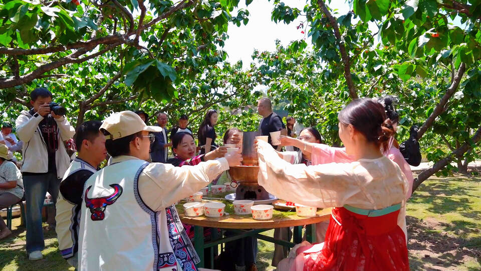 樱桃的甜蜜也吸引了不少游客专程前来。樱桃林间随处可见三五成群的游客,他们手提小篮,一边采摘品尝,一边拍照打卡,欢声笑语与果香交织,定格樱桃满园的春日美景。而让游客最难忘的,莫过于热辣火锅与清甜樱桃的相互交融,游客们围坐桌前,一边品尝热气腾腾的特色火锅,一边享用刚摘的新鲜樱桃,大家畅谈游玩感受,分享采摘乐趣,沉浸式感受独属于落水洞的田园生活美好。