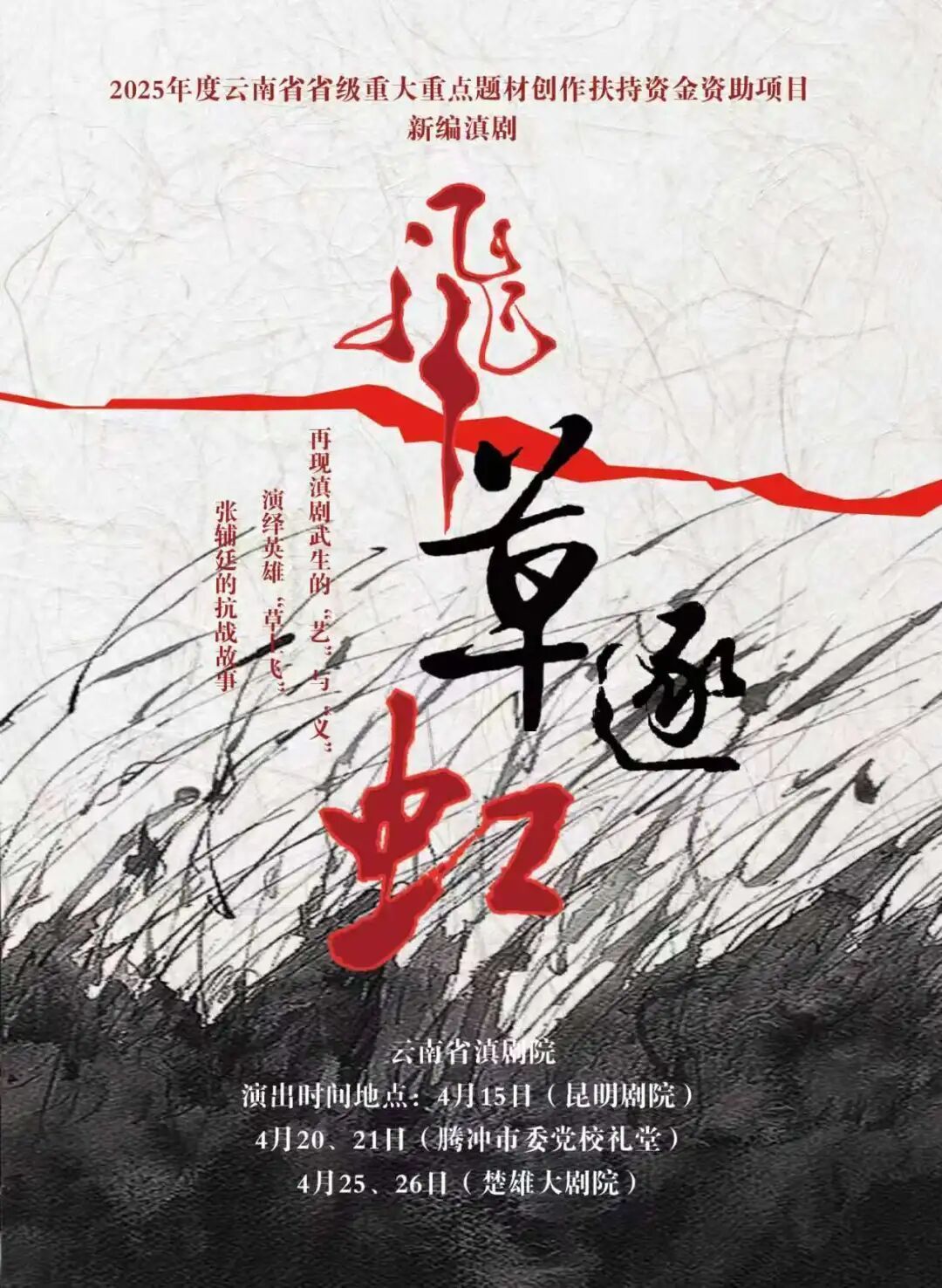 滇韵承文脉,戏魂铸初心。为传承国家级非物质文化遗产滇剧瑰宝,铭记滇西抗战历史,缅怀革命先烈,赓续红色基因,我们诚挚邀请您共赴一场戏曲与家国情怀的视听盛宴——新编滇剧《飞草逐虹》免费演出,以戏为媒,重温那段“戏魂”与“战魂”交织的峥嵘岁月。
