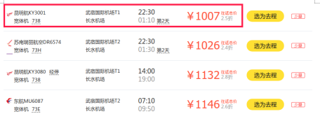 从行程看,从太原出发至昆明出发时查询的往返机票价格1007元。