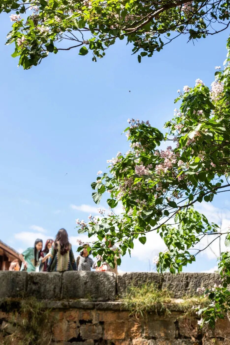 束河古镇内,楸木花静静绽放,淡紫与洁白的花朵缀满枝头,掩映在青石板路、古桥流水与纳西古院之间,温婉雅致,漫步其中悠然惬意,随手一拍都是治愈系亲子大片。